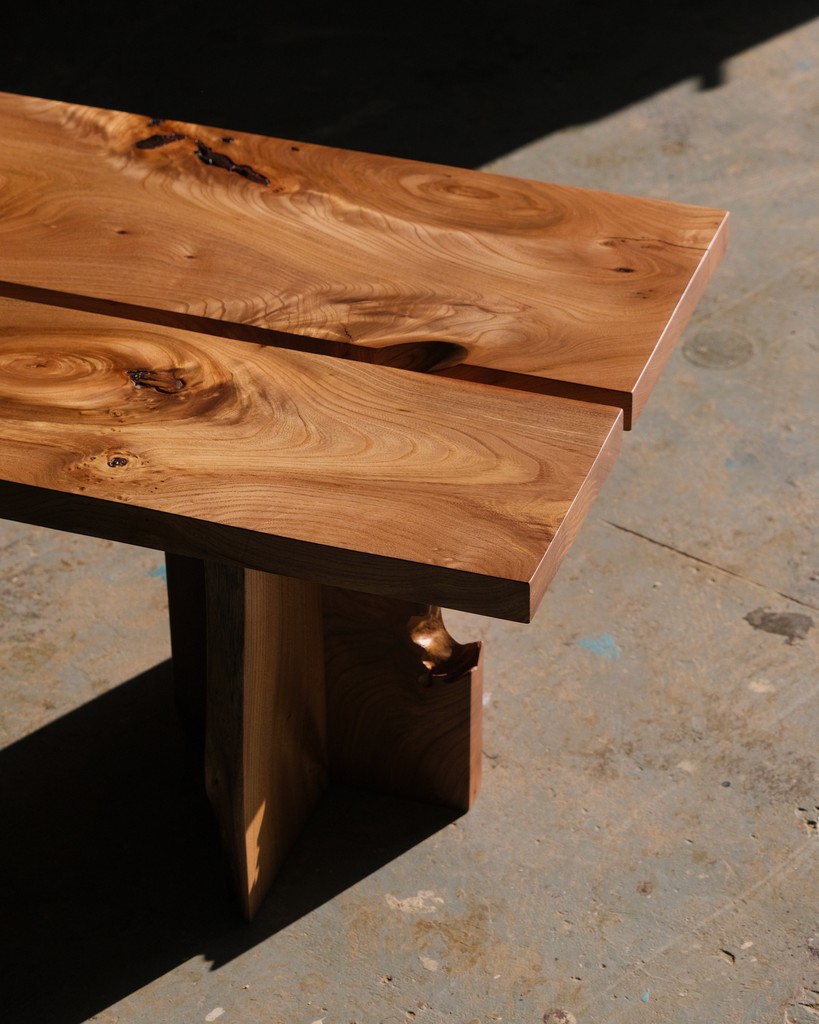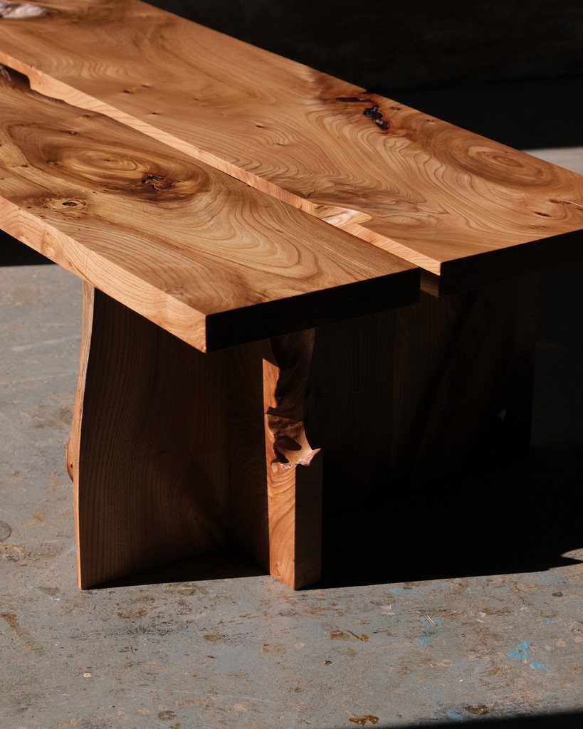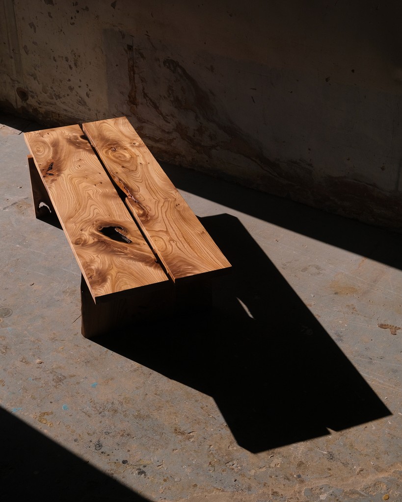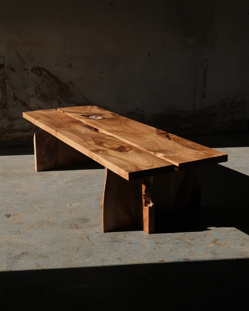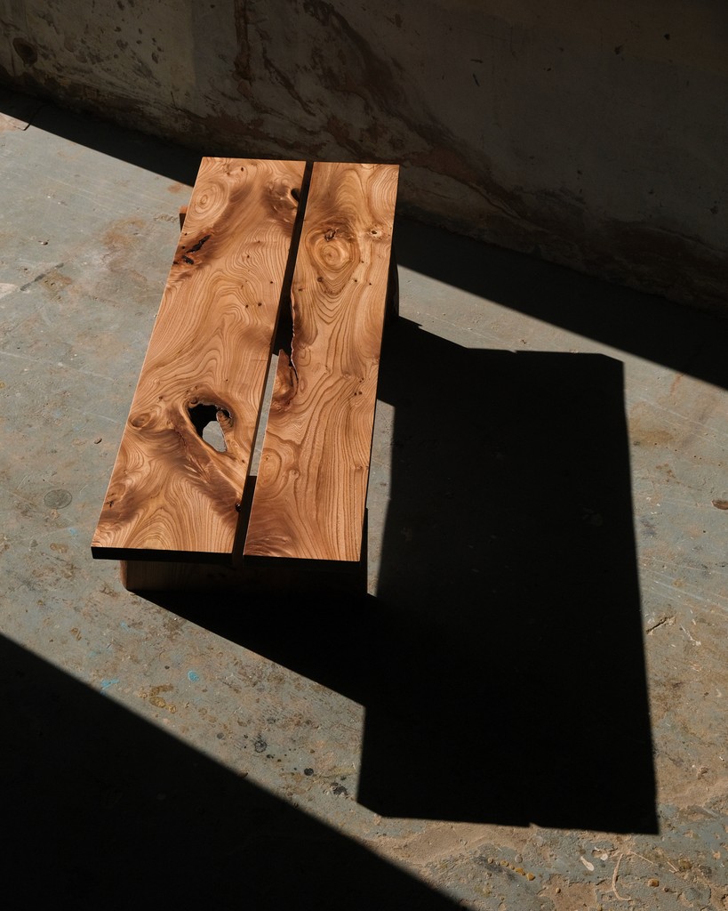This low coffee table continues the collection’s dialogue between raw material and refined form. Composed of two Elm panels split by a central gap, the piece balances sharp, geometric lines with the wild, swirling grain of the timber. A mix of straight and waney edges allows the wood’s irregular character to stand against the clean planes of the top. The design remains simple and minimal, giving space for the Elm’s natural movement and the striking voids left by Dutch Elm Disease to take centre stage.